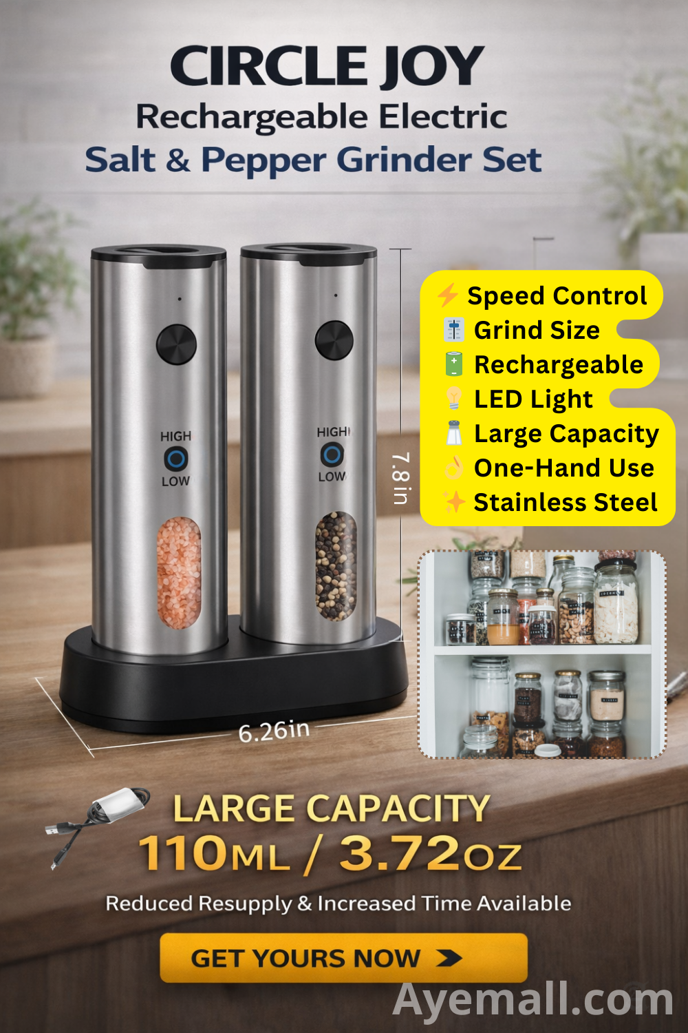 That’s where the CIRCLE JOY Rechargeable Electric Salt and Pepper Grinder Set comes in. Designed for convenience and consistency, this modern grinder set lets you season your food with just one press of a button.