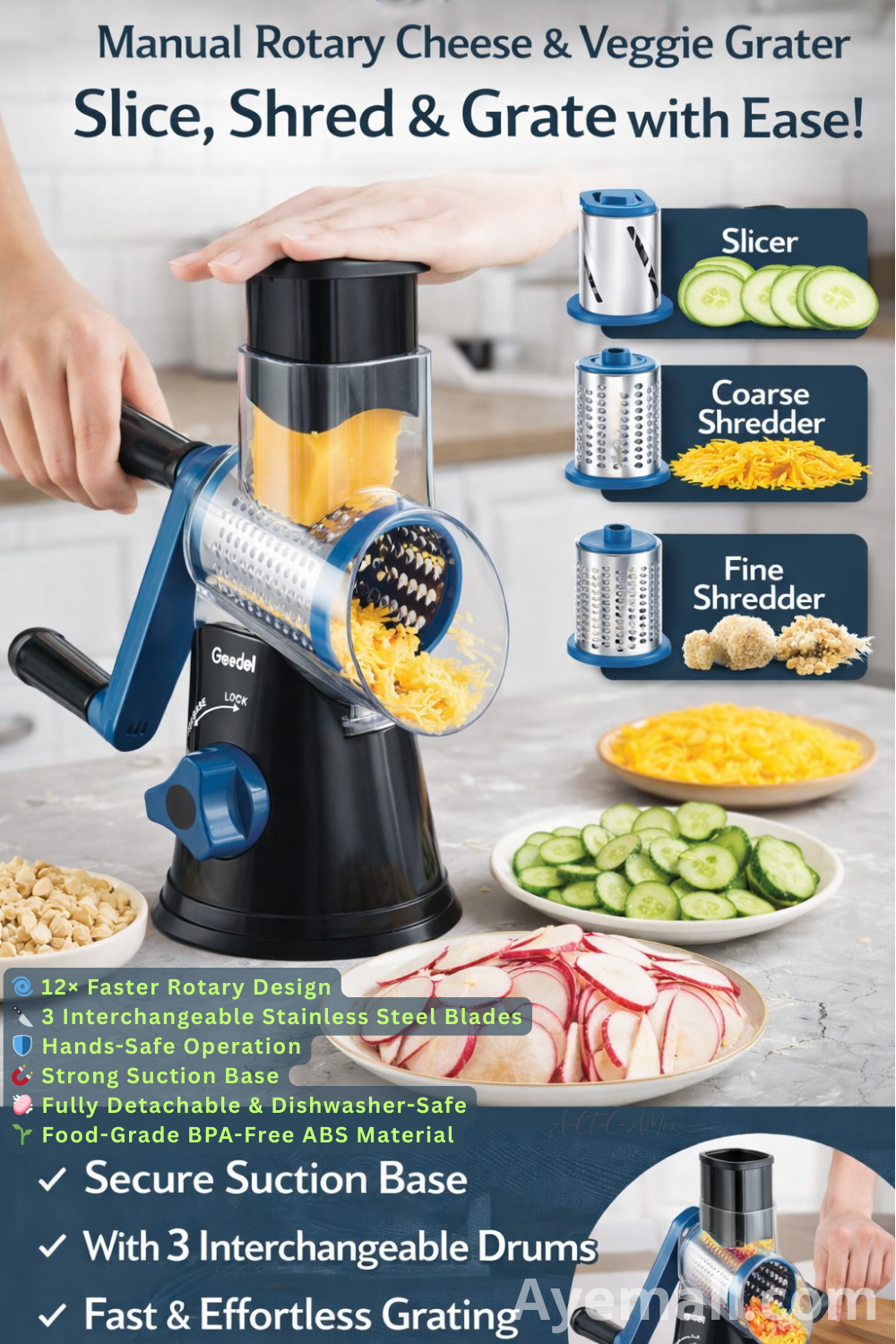 The Geedel Rotary Cheese Grater turns everyday kitchen prep into a fast, safe, and enjoyable experience. With three interchangeable stainless-steel blades, a powerful suction base, and a hands-free rotary handle, this smart kitchen tool lets you shred, slice, and grind ingredients up to 12× faster than traditional box graters.